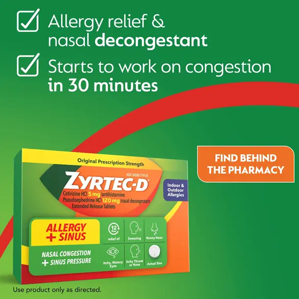 The proven allergy relief of ZYRTEC® plus a decongestant to provide powerful allergy congestion relief. ZYRTEC-D® Allergy Relief and Nasal Decongestant Tablets contain 5 mg cetirizine HCl antihistamine and 120 mg pseudoephedrine decongestant for relief from nasal congestion, sinus pressure, and allergy symptoms caused by pollen, dust, pet dander, mold, and other airborne allergens. These 2-in-1 allergy medicine tablets get to work in as little as 30 minutes, for fast allergy congestion relief that lasts for 12 hours.