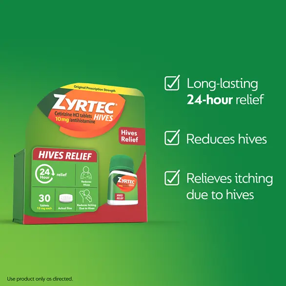 Help reduce hives and relieve uncomfortable hive-related itching with ZYRTEC® 24 Hour Hives Relief Tablets. Each antihistamine tablet is formulated with 10 mg of cetirizine hydrochloride to help reduce hives and relieve itching due to hives (urticaria). These antihistamine tablets start to work fast to reduce hives and relieve hive-related itching in under 45 minutes. Pack a bottle of ZYRTEC® Hives Relief medicine in your bag to help relieve hive related itching and reduce hives while on the go. Choose ZYRTEC®, the #1 doctor and allergist-recommended brand among OTC oral antihistamines.